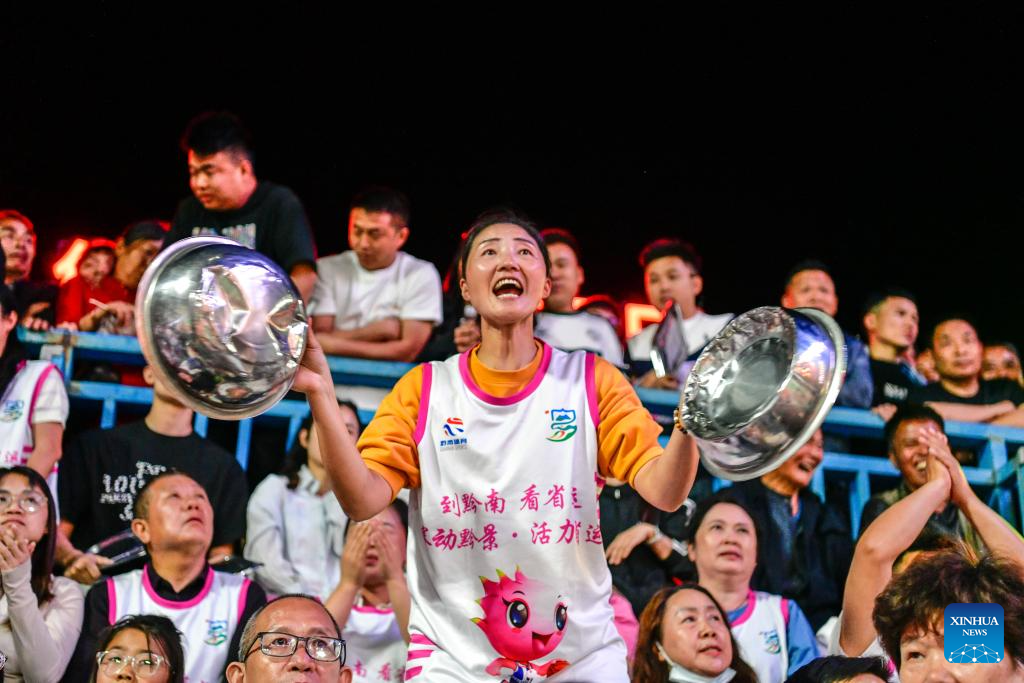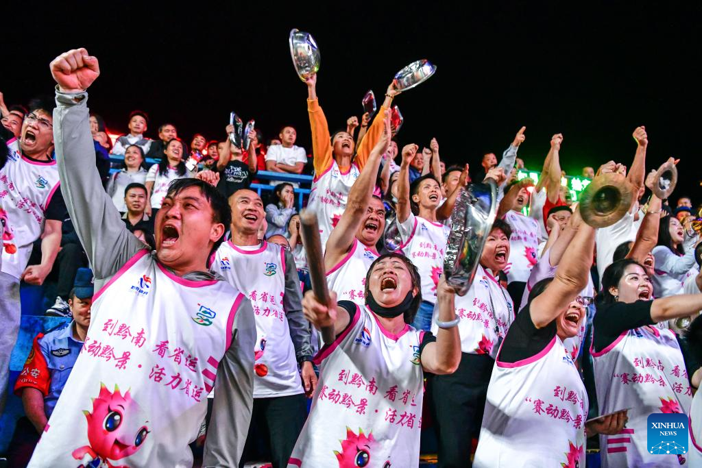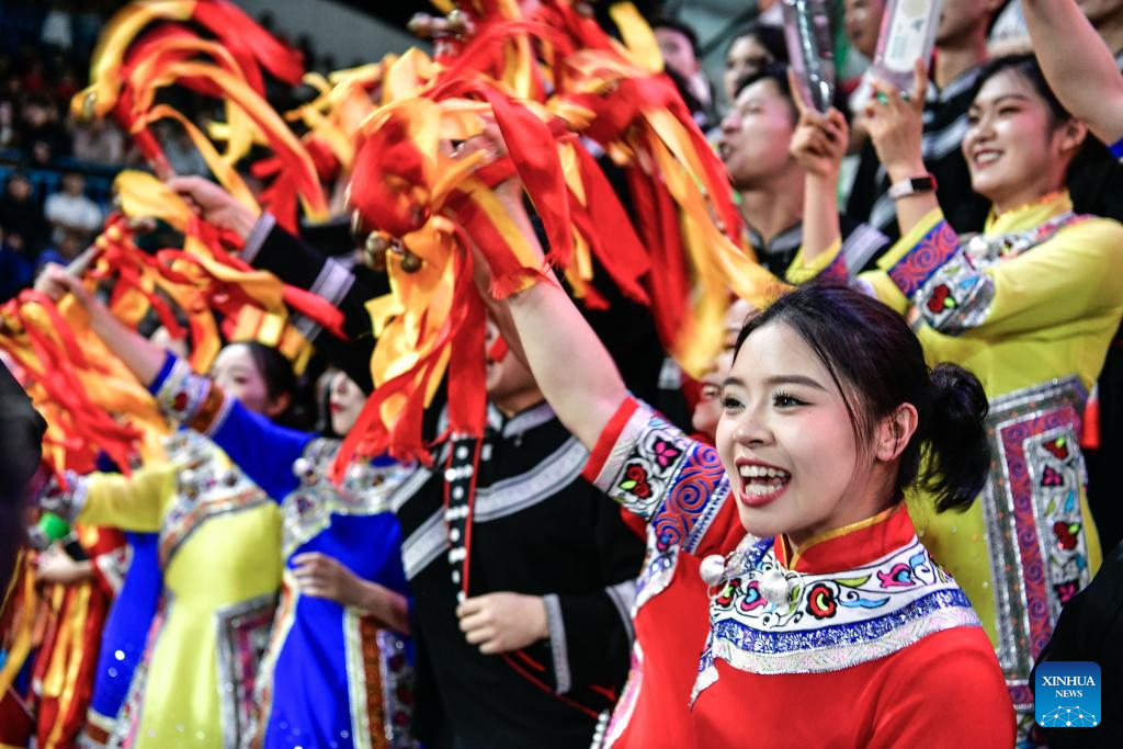 Fans with ethnic costumes cheer during the final match between Kaili City and Yanhe County at the 2026 China's Village Basketball Competition in Taipan Village, Taijiang County, southwest China's Guizhou Province, April 11, 2026. (Xinhua/Yang Wenbin)