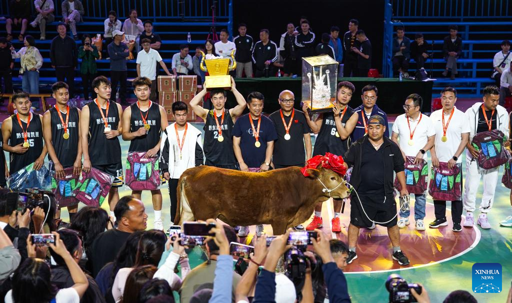 Winners team Kaili celebrate with an ox as the prize after the final match between Kaili City and Yanhe County at the 2026 China's Village Basketball Competition in Taipan Village, Taijiang County, southwest China's Guizhou Province, April 11, 2026. (Xinhua/Yang Wenbin)