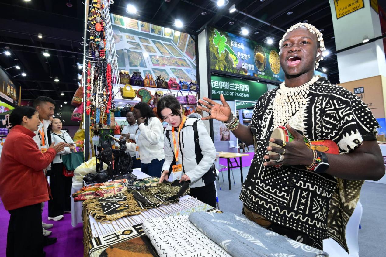 A Ghanaian exhibitor promotes handicrafts from Ghana at the China Yiwu International Commodities Fair -- Import Goods Exhibition held in Yiwu, east China's Zhejiang province, Nov. 13, 2025. (Photo/Lyu Bin)