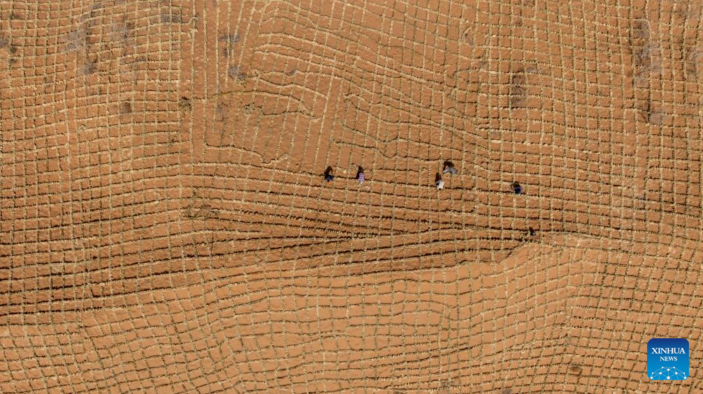 An aerial drone photo taken on April 10, 2026 shows straw checkerboard barriers in the Tengger Desert, northwest China's Ningxia Hui Autonomous Region. Workers in Zhongwei City are upgrading desert barriers in the Tengger Desert by laying new straw checkerboard barriers to improve desert control efficiency. (Xinhua/Yang Zhisen)