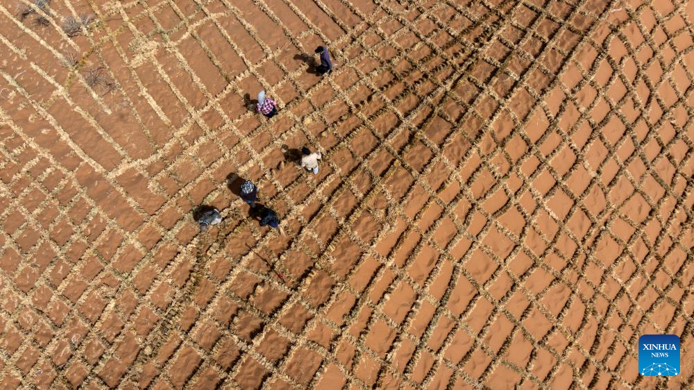 Workers pave straw checkerboard barriers on sand in the Tengger Desert, northwest China's Ningxia Hui Autonomous Region, April 10, 2026. Workers in Zhongwei City are upgrading desert barriers in the Tengger Desert by laying new straw checkerboard barriers to improve desert control efficiency. (Xinhua/Wang Peng)