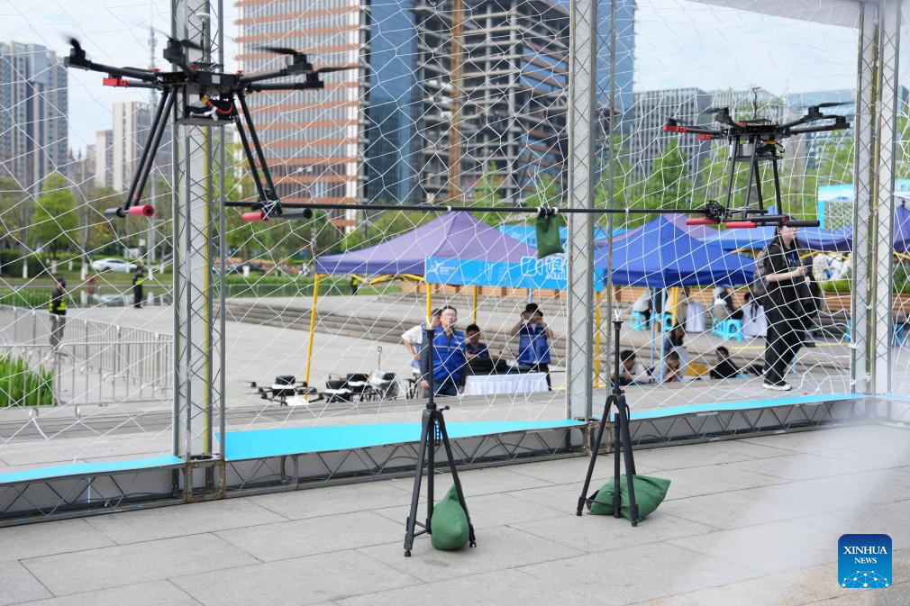 Two drones operated by competitors lift a bar in the drone weightlifting event during a drone sports meeting which combines technology and competitive sports in Chengdu, southwest China's Sichuan Province, April 11, 2026. (Xinhua/Xu Bingjie)