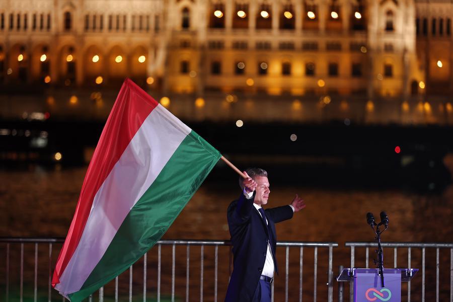 Peter Magyar, leader of Hungary's Tisza Party, attends a victory rally in Budapest, Hungary, April 12, 2026. (Photo by David Balogh/Xinhua)