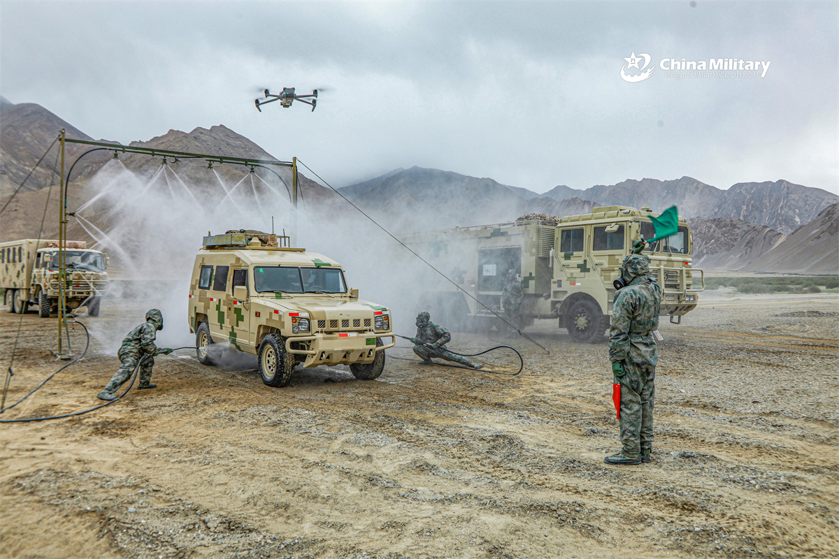Soldiers assigned to the Chinese PLA Army decontaminate simulated chemical-contaminated vehicles during a Chemical, Biological, Radioactive and Nuclear (CBRN) decontamination drill. (eng.chinamil.com.cn/Photo by Zeng Cunjun, Li Zhiqiang and Li Yadong)