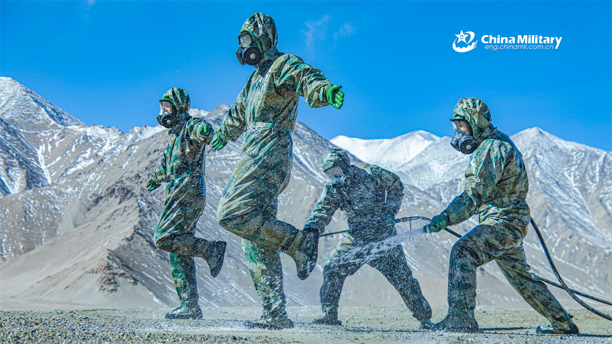 Soldiers assigned to the Chinese PLA Army spray down the teammates' protective gear during a Chemical, Biological, Radioactive and Nuclear (CBRN) decontamination drill. (eng.chinamil.com.cn/Photo by Zeng Cunjun, Li Zhiqiang and Li Yadong)