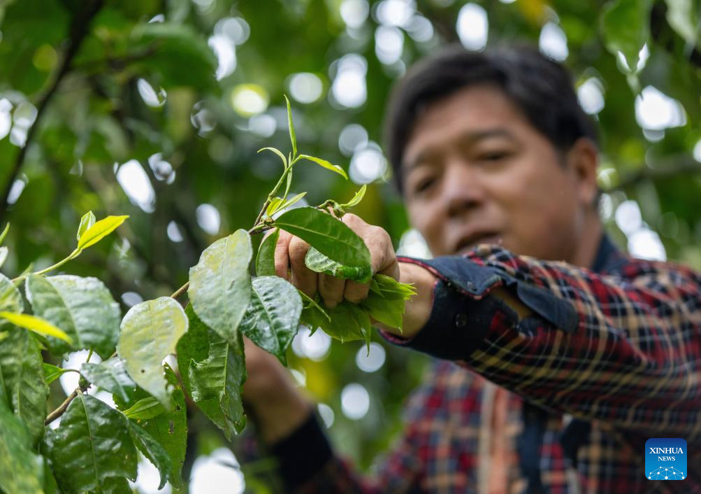 - Farmers sun-dry spring tea leaves on Jingmai Mountain in SW China's Yunnan