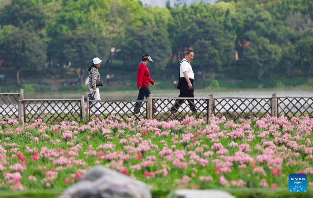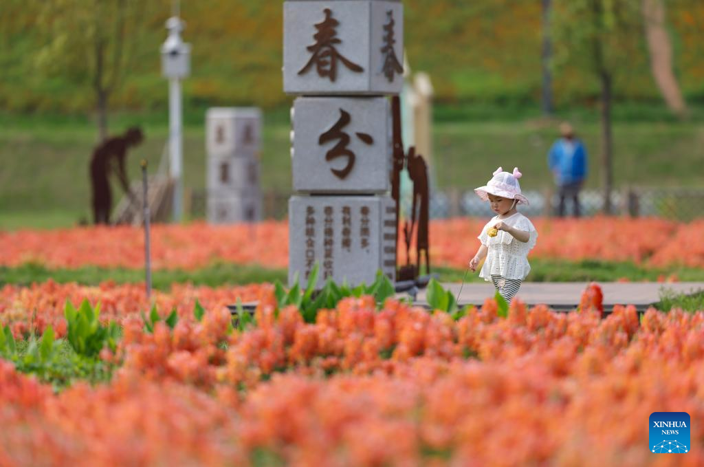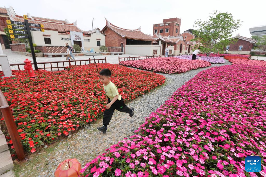 A child runs among flowers in the Long Jiang Years tourist area in Zhangzhou City, southeast China's Fujian Province, on April 11, 2026.