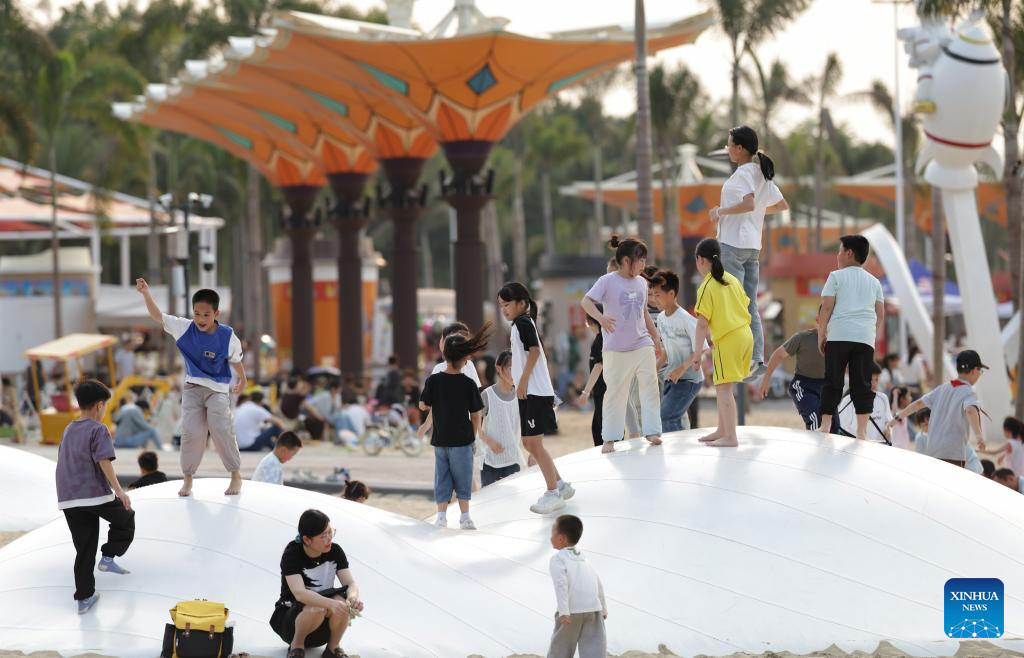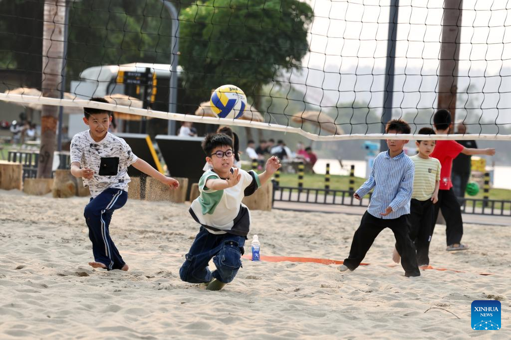 Children play beach volleyball in the Long Jiang Years tourist area in Zhangzhou City, southeast China's Fujian Province, on April 11, 2026.