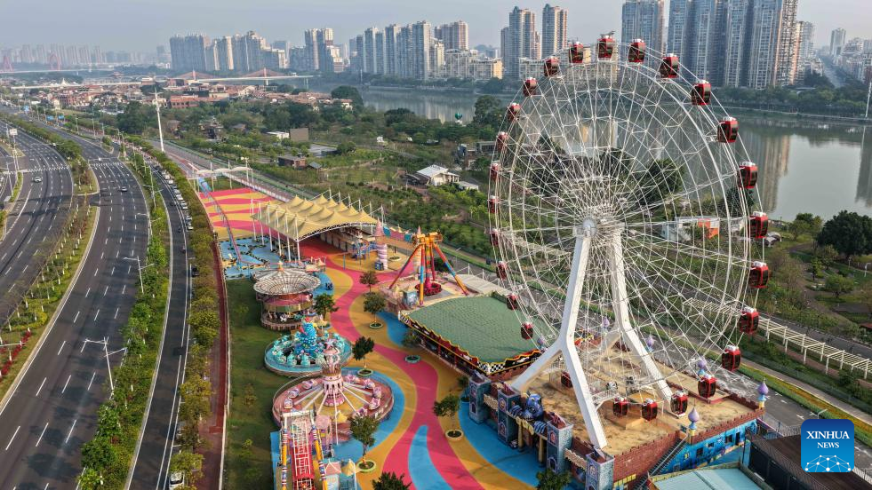 An aerial drone photo taken on April 12, 2026 shows amusement facilities in the Long Jiang Years tourist area in Zhangzhou City, southeast China's Fujian Province.