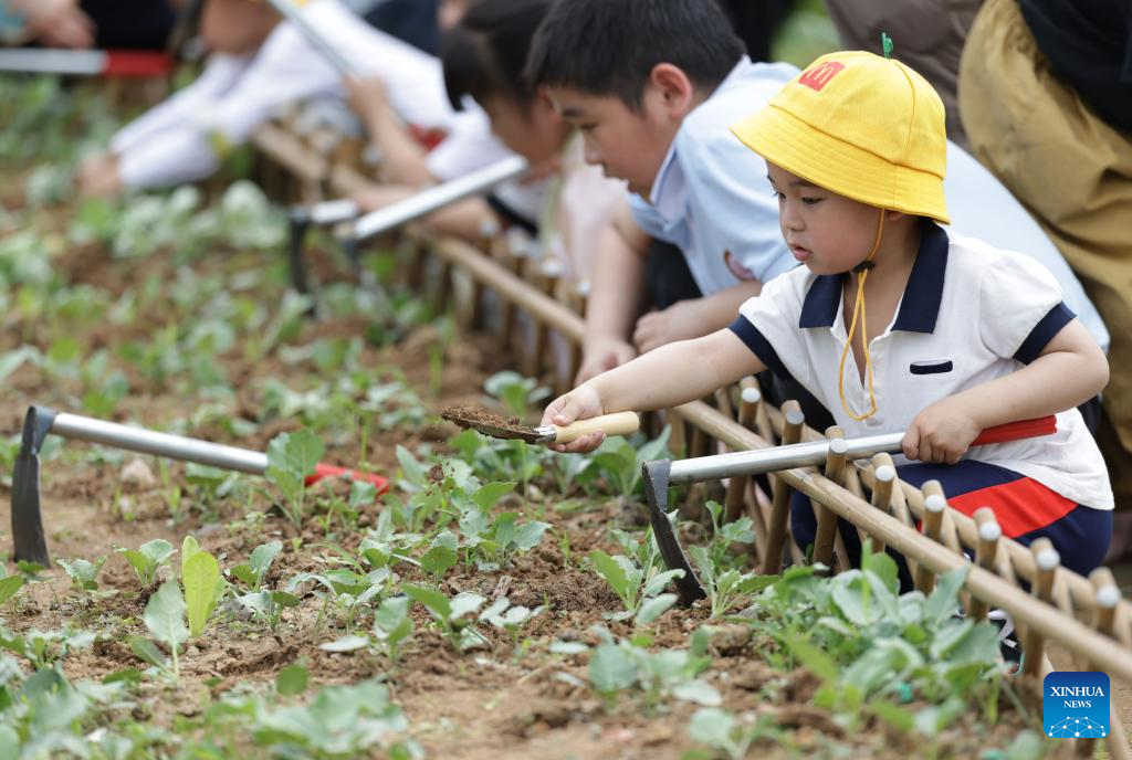 Children experience farm work in a vegetable garden in the Long Jiang Years tourist area in Zhangzhou City, southeast China's Fujian Province, on April 11, 2026.