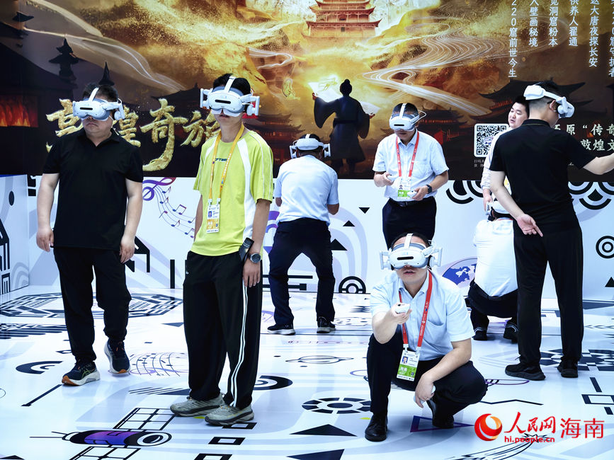 People wearing wearable devices take a virtual tour of the Mogao Grottoes in Dunhuang, northwest China's Gansu Province, during the 6th China International Consumer Products Expo (CICPE) in Haikou, south China's Hainan Province. (People's Daily Online/Fu Zemin)