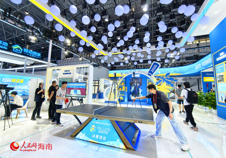 People play table tennis on a table from the same brand as those used at the ITTF-ATTU Asian Cup Haikou 2026 during the 6th China International Consumer Products Expo (CICPE) in Haikou, south China's Hainan Province. (People's Daily Online/Fu Zemin)