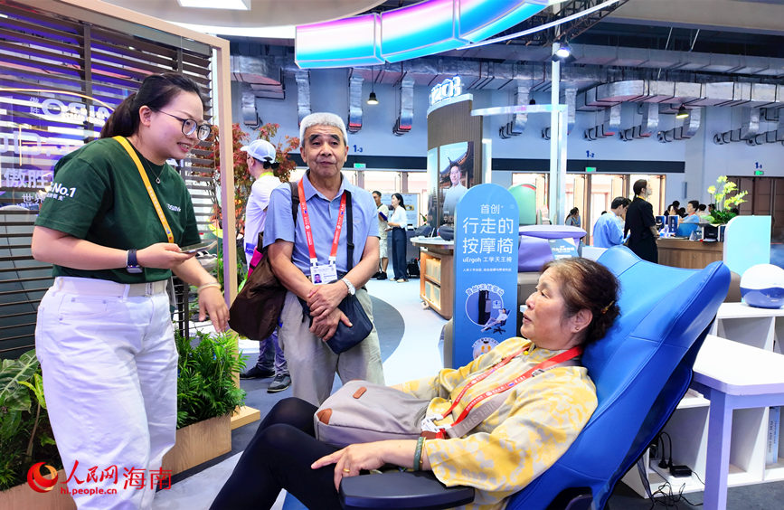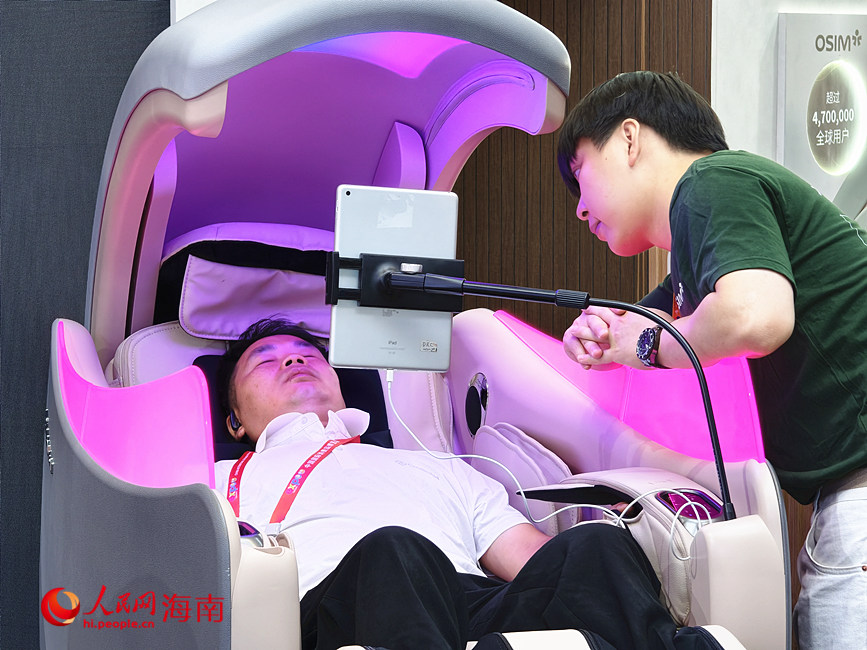An AI massage chair provides a visitor with an immersive wellness experience during the 6th China International Consumer Products Expo (CICPE) in Haikou, south China's Hainan Province. (People's Daily Online/Fu Zemin)