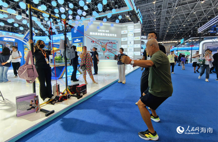 A visitor takes part in a resistance rope challenge during the 6th China International Consumer Products Expo (CICPE) in Haikou, south China's Hainan Province. (People's Daily Online/Fu Zemin)