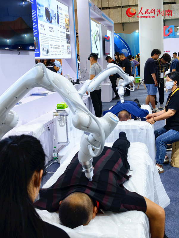 Visitors experience massage robots during the 6th China International Consumer Products Expo (CICPE) in Haikou, south China's Hainan Province. (People's Daily Online/Fu Zemin)