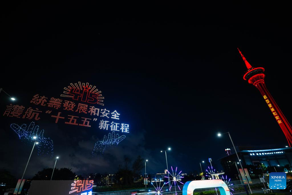 This photo taken on April 15, 2026 shows a drone light show as one of a series of national security education activities in Macao, south China. (Xinhua/Cheong Kam Ka)