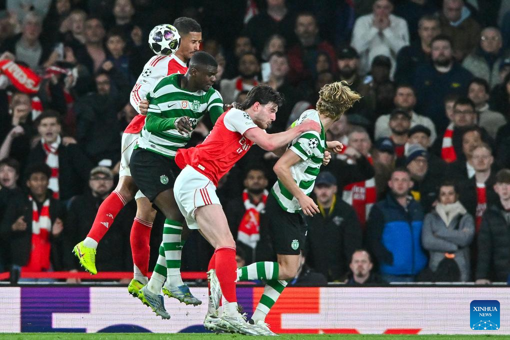 (from R to L) Trincao of Sporting CP, Declan Rice of Arsenal, Ousmande Diomande of Sporting CP and William Saliba of Arsenal battle for the ball during the UEFA Champions League quarterfinal 2nd Leg football match between Arsenal and Sporting CP in London, Britain, April 15, 2026. (Xinhua)