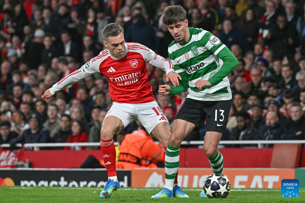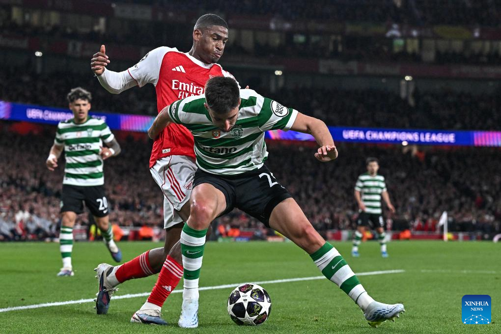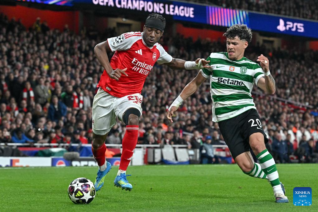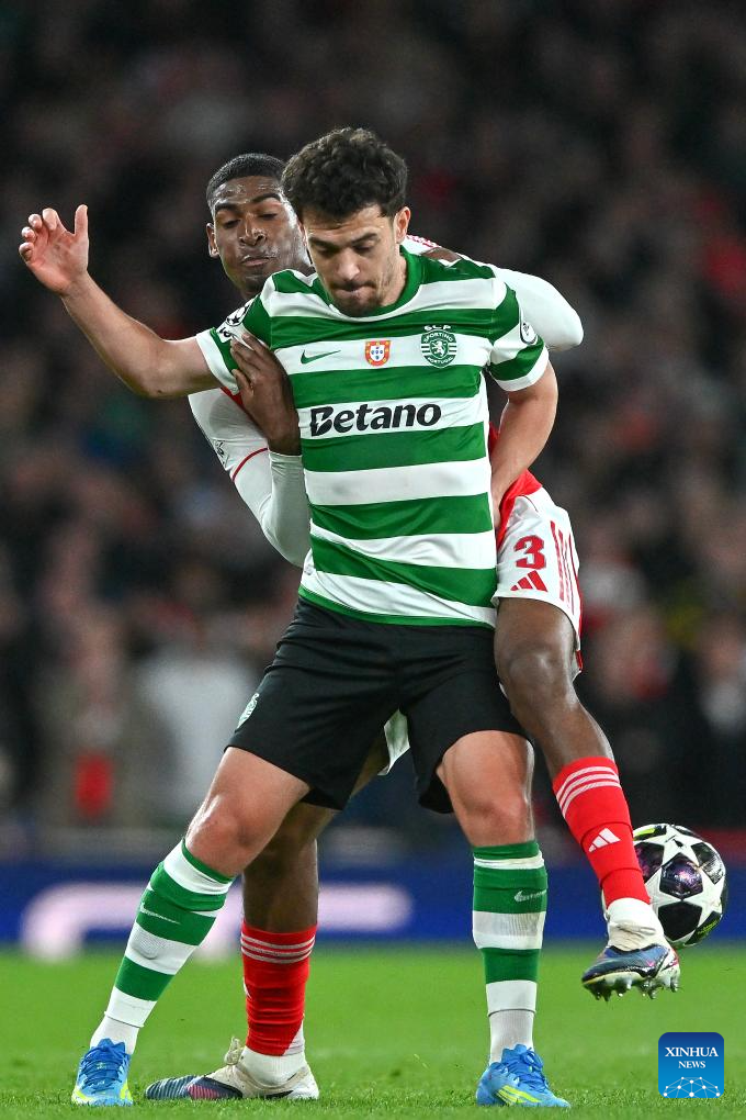 Daniel Braganca (R) of Sporting CP vies with Cristian Mosquera of Arsenal during the UEFA Champions League quarterfinal 2nd Leg football match between Arsenal and Sporting CP in London, Britain, April 15, 2026. (Xinhua)