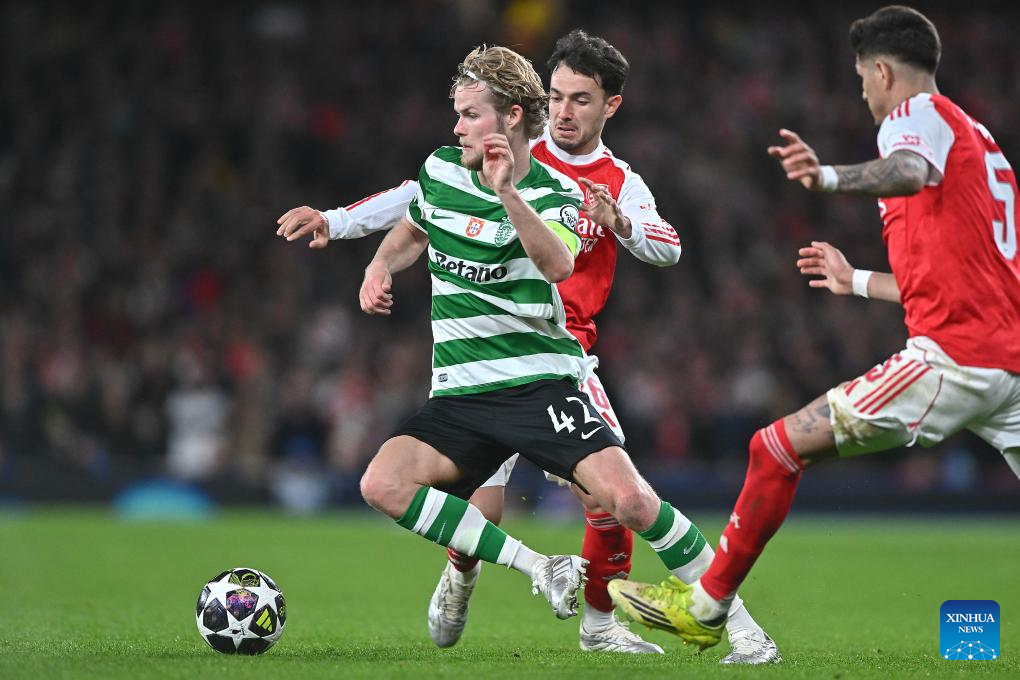 Morten Hjulmand (L) of Sporting CP battles with Martin Zubimendi (C) of Arsenal during the UEFA Champions League quarterfinal 2nd Leg football match between Arsenal and Sporting CP in London, Britain, April 15, 2026. (Xinhua)