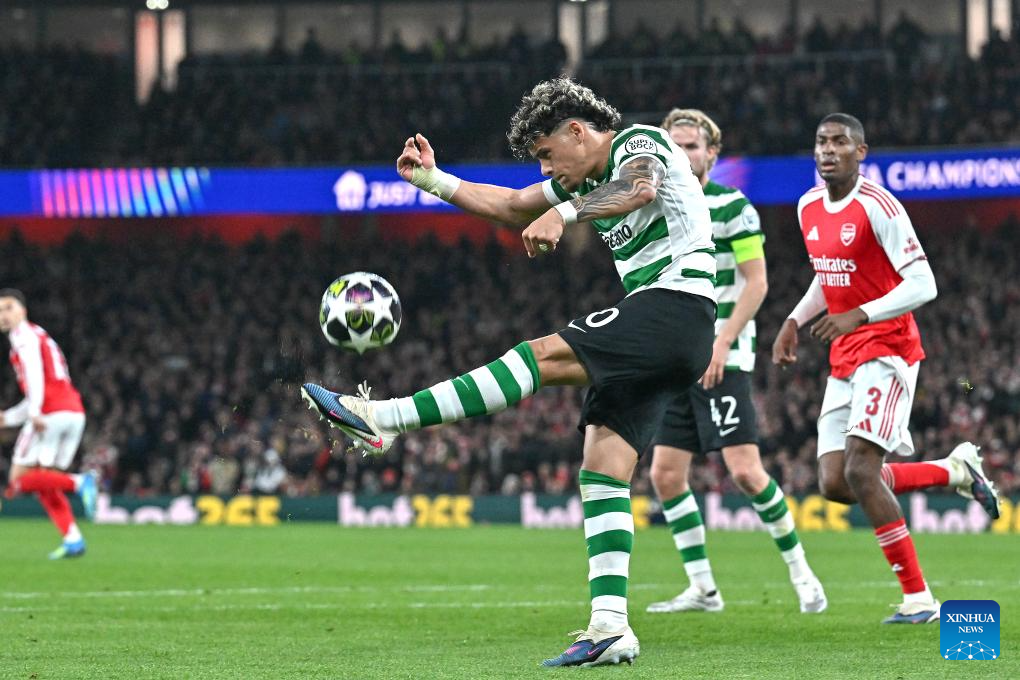 Maximiliano Araujo (L) of Sporting CP kicks the ball during the UEFA Champions League quarterfinal 2nd Leg football match between Arsenal and Sporting CP in London, Britain, April 15, 2026. (Xinhua)