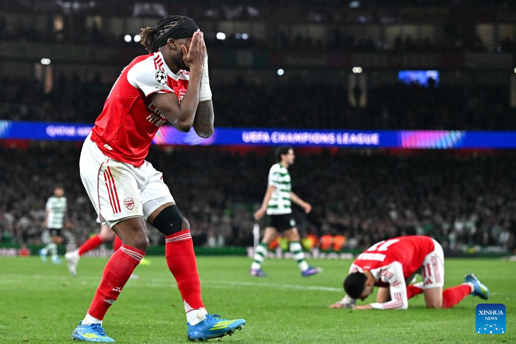 Noni Madueke (L) of Arsenal looks dejected during the UEFA Champions League quarterfinal 2nd Leg football match between Arsenal and Sporting CP in London, Britain, April 15, 2026. (Xinhua)