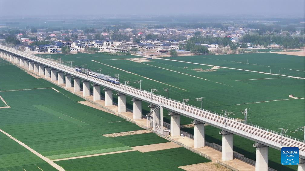 This aerial drone photo taken on April 15, 2026 shows a test train passing through a bridge along the Xiong'an-Shangqiu High-speed Railway in north China's Hebei Province. The Hebei section of the Xiong'an-Shangqiu High-speed Railway kicked off its coordinated debugging and test on Wednesday.