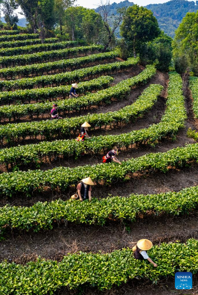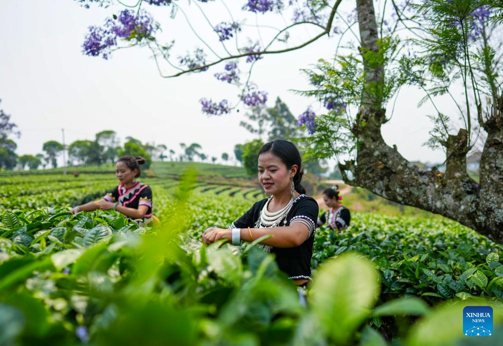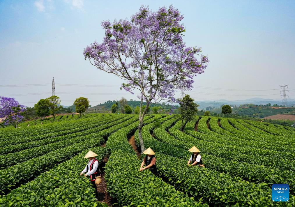 Farmers pick tea leaves at a tea garden in Simao District of Pu'er City, southwest China's Yunnan Province, April 15, 2026. (Xinhua/Chen Xinbo)