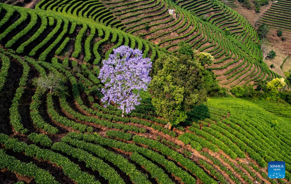 An aerial drone photo taken on April 15, 2026 shows a tea garden in Simao District of Pu'er City, southwest China's Yunnan Province. (Xinhua/Chen Xinbo)