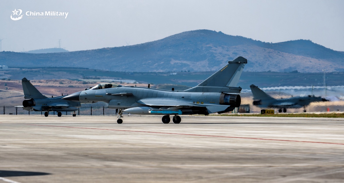 J-10C fighter jets attached to an aviation brigade of the air force under the Chinese PLA Southern Theater Command taxi on the runway during an air combat training exercise in early April, 2026. (eng.chinamil.com.cn/Photo by Xiao Rui)