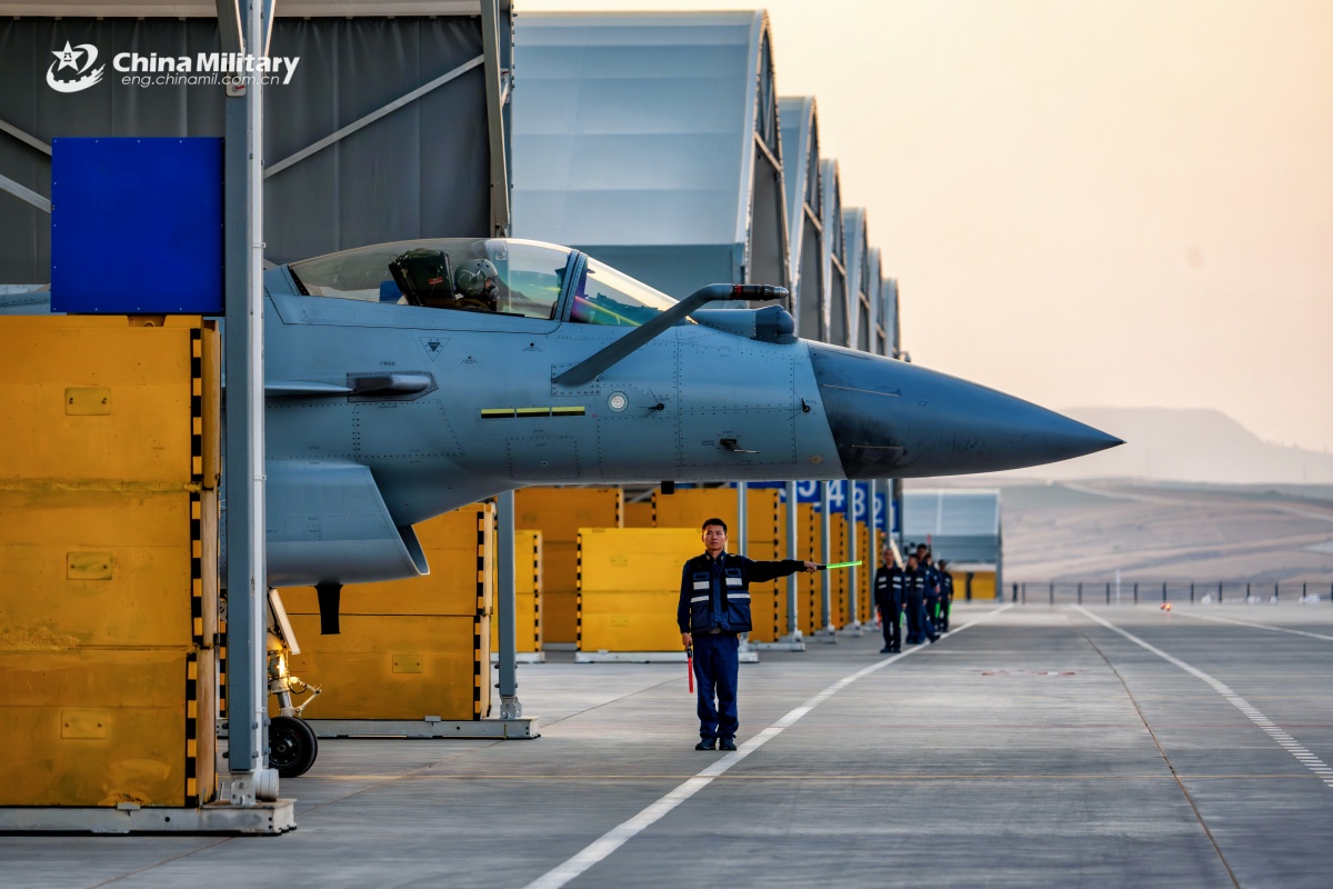 A ground crew member assigned to an aviation brigade of the air force under the Chinese PLA Southern Theater Command guides a J-10C fighter jet to leave the hangar during an air combat training exercise in early April, 2026. (eng.chinamil.com.cn/Photo by Xiao Rui)