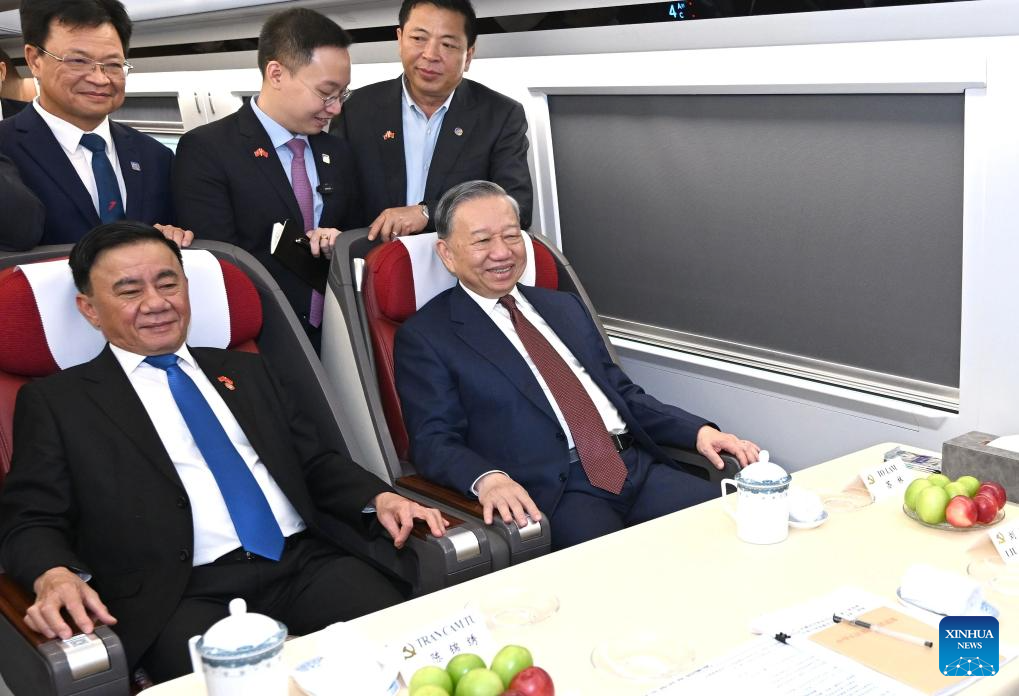 General Secretary of the Communist Party of Vietnam Central Committee and Vietnamese President To Lam, who is on a state visit to China, takes a high-speed train to leave Beijing, capital of China, for south China's Guangxi Zhuang Autonomous Region, April 16, 2026. (Xinhua/Dai Tianfang)