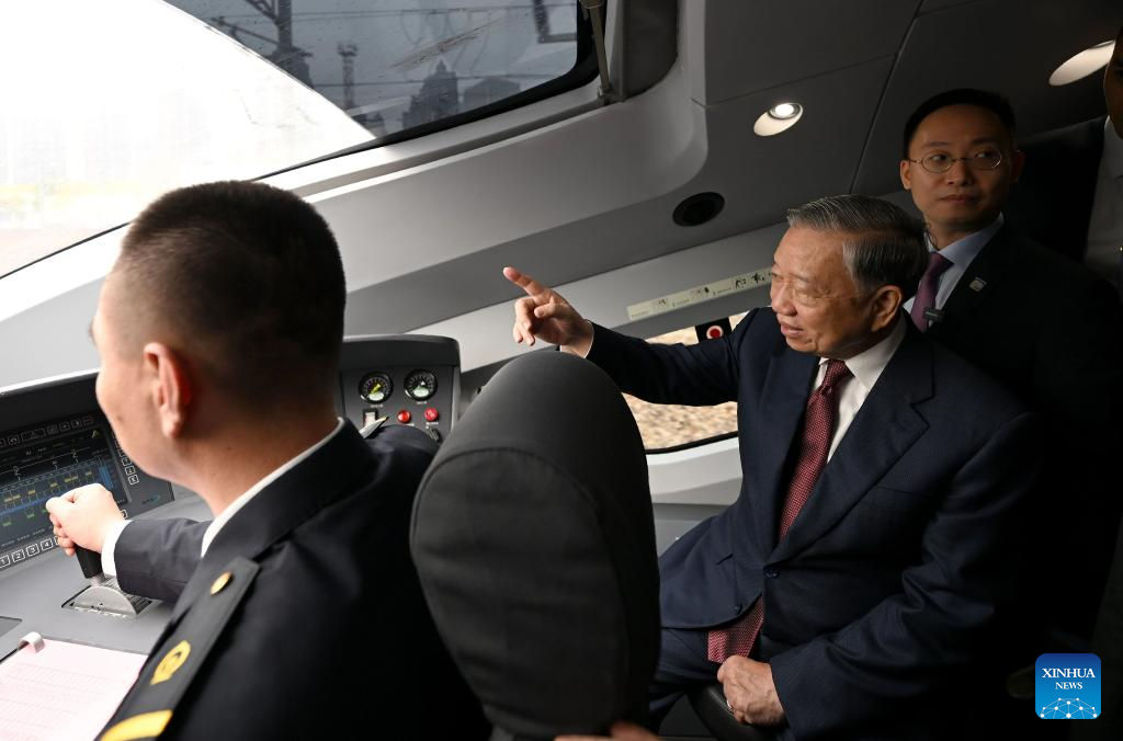 General Secretary of the Communist Party of Vietnam Central Committee and Vietnamese President To Lam, who is on a state visit to China, tours the driver's cabin as he takes a high-speed train on his way from Beijing, capital of China, to south China's Guangxi Zhuang Autonomous Region, April 16, 2026. (Xinhua/Dai Tianfang)