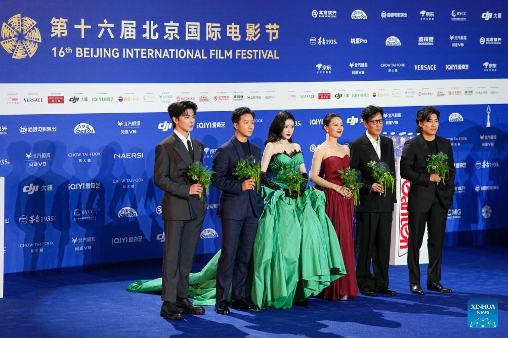 Zheng Zhi (1st R), director of the film "All The Good Eyes", and cast members of the film including Yu Hewei (2nd R), Gao Yuanyuan (3rd R), Zhang Tian'ai (3rd L), Han Geng (2nd L) and Xia Zhiguang (1st L) pose for a group photo on the red carpet of the 16th Beijing International Film Festival (BJIFF) in Beijing, capital of China, April 16, 2026. The 16th BJIFF kicked off at the Yanqi Lake International Convention &Exhibition Center here on Thursday. (Xinhua/Ju Huanzong)