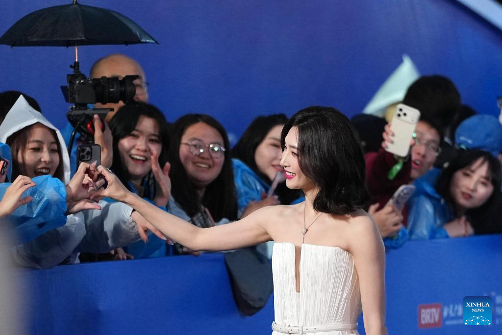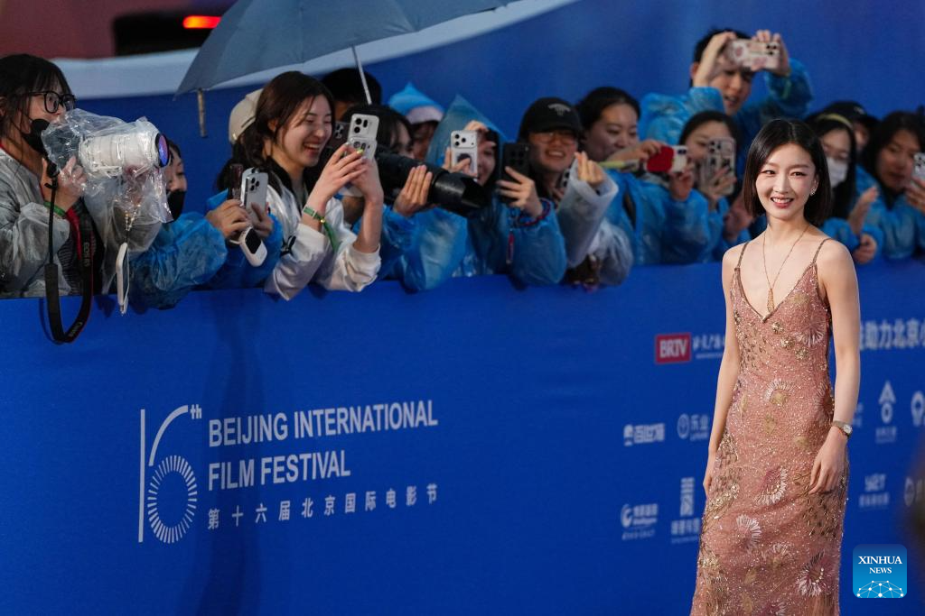 Actress Zhou Dongyu appears on the red carpet of the 16th Beijing International Film Festival (BJIFF) in Beijing, capital of China, April 16, 2026. The 16th BJIFF kicked off at the Yanqi Lake International Convention &Exhibition Center here on Thursday. (Xinhua/Ju Huanzong)