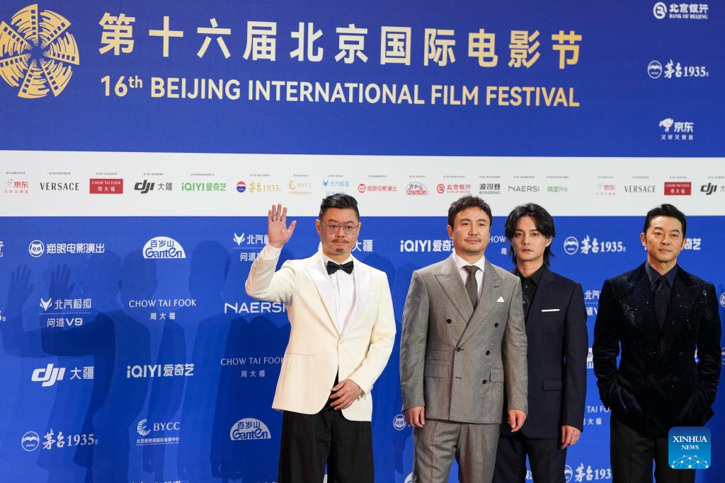 Actors Wei Xiang, Shen Teng, Yin Zheng and Sha Yi (from left to right), who star in the film "Pegasus 3," pose for a group photo on the red carpet of the 16th Beijing International Film Festival (BJIFF) in Beijing, capital of China, April 16, 2026. The 16th BJIFF kicked off at the Yanqi Lake International Convention &Exhibition Center here on Thursday. (Xinhua/Ju Huanzong)
