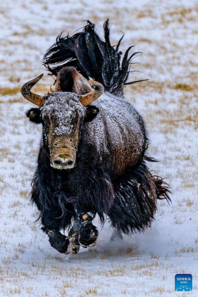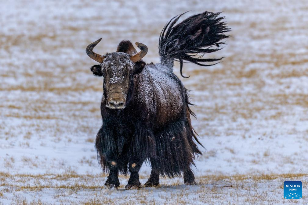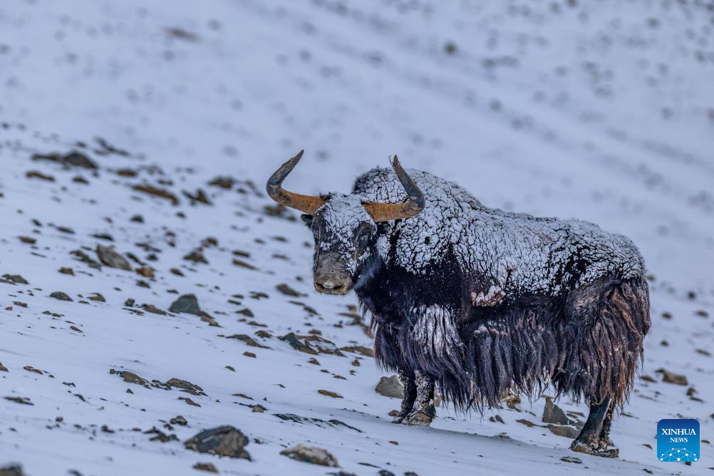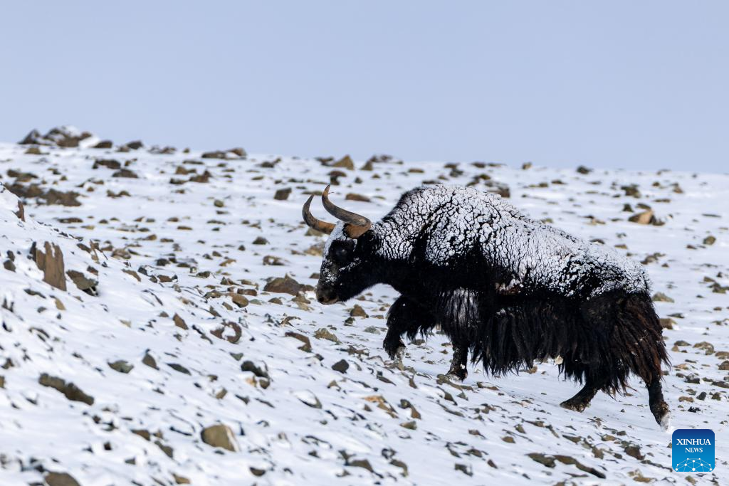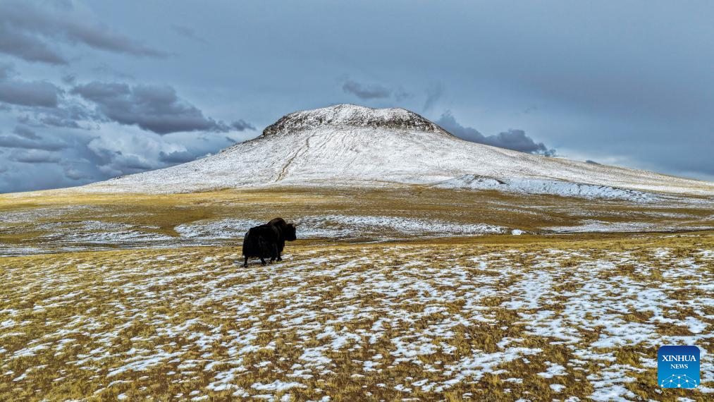 A wild yak is pictured at the Bamoqongzong extinct volcanic cluster area in the Changtang National Nature Reserve, southwest China's Xizang Autonomous Region, April 10, 2026. The Bamoqongzong extinct volcanic cluster is located deep within the Changtang National Nature Reserve, at an average elevation of approximately 5,000 meters. (Xinhua/Jiang Fan)
