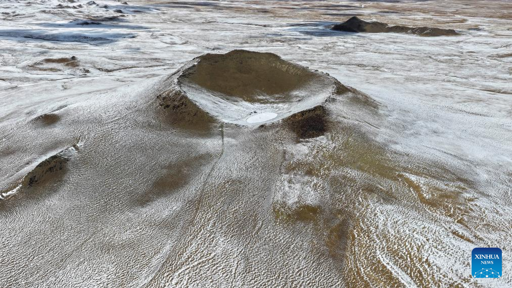 An aerial drone photo taken on April 10, 2026 shows a view of the Bamoqongzong extinct volcanic cluster area in the Changtang National Nature Reserve, southwest China's Xizang Autonomous Region. The Bamoqongzong extinct volcanic cluster is located deep within the Changtang National Nature Reserve, at an average elevation of approximately 5,000 meters. (Photo by Liang Chunning/Xinhua)