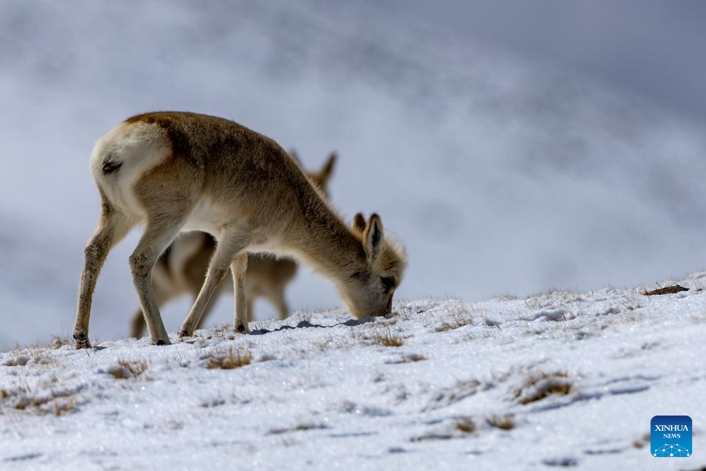 Tibetan gazelles are pictured at the Bamoqongzong extinct volcanic cluster area in the Changtang National Nature Reserve, southwest China's Xizang Autonomous Region, April 10, 2026. The Bamoqongzong extinct volcanic cluster is located deep within the Changtang National Nature Reserve, at an average elevation of approximately 5,000 meters. (Xinhua/Jiang Fan)
