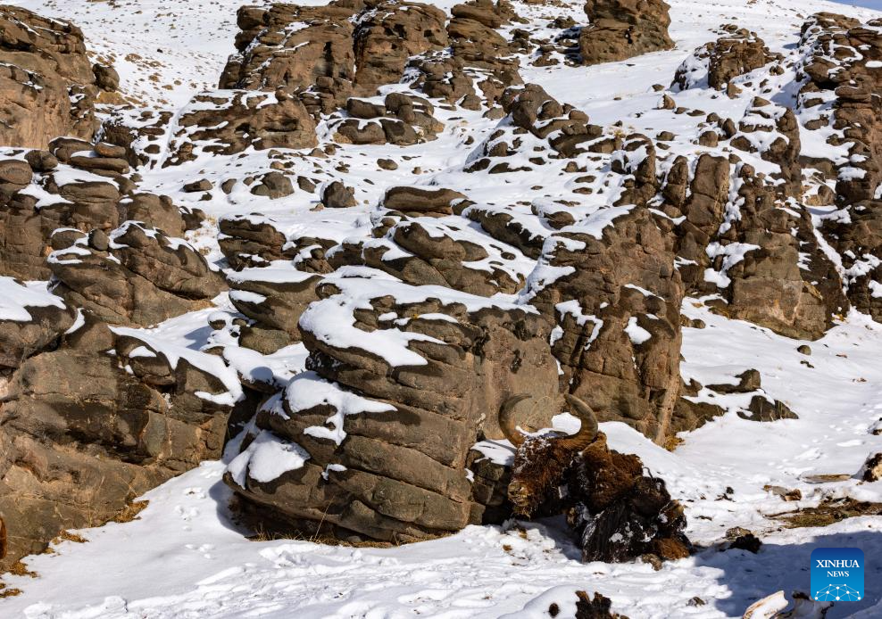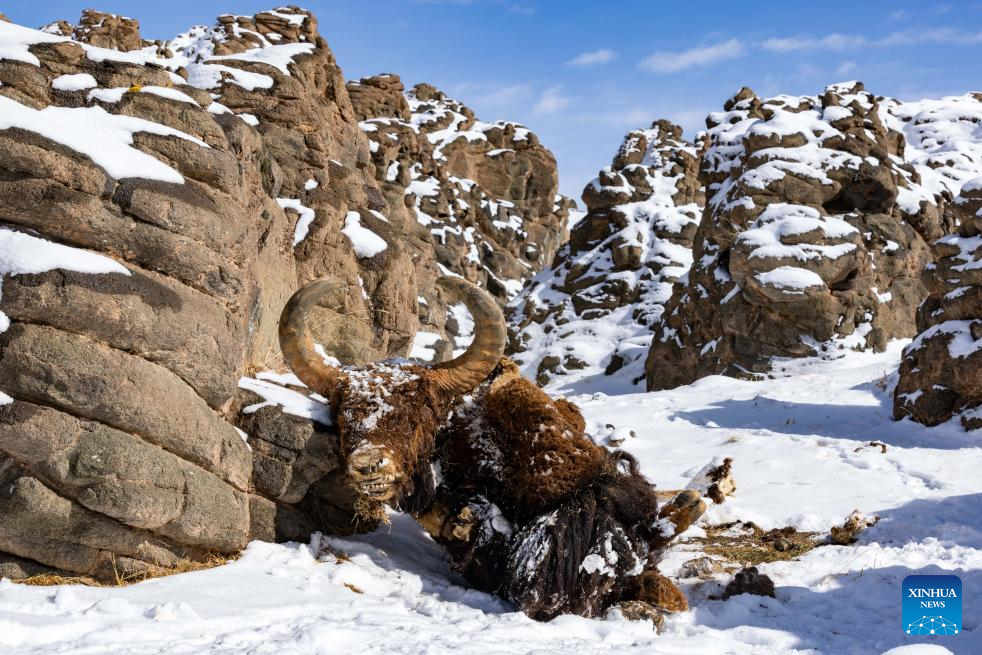 The remains of a wild yak is pictured at the Bamoqongzong extinct volcanic cluster area in the Changtang National Nature Reserve, southwest China's Xizang Autonomous Region, April 10, 2026. The Bamoqongzong extinct volcanic cluster is located deep within the Changtang National Nature Reserve, at an average elevation of approximately 5,000 meters. (Xinhua/Jiang Fan)