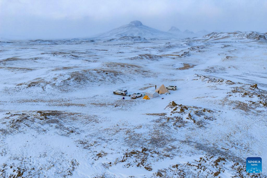 An aerial drone photo taken on April 11, 2026 shows rangers camping at the Bamoqongzong extinct volcanic cluster area in the Changtang National Nature Reserve, southwest China's Xizang Autonomous Region. The Bamoqongzong extinct volcanic cluster is located deep within the Changtang National Nature Reserve, at an average elevation of approximately 5,000 meters. (Xinhua/Jiang Fan)