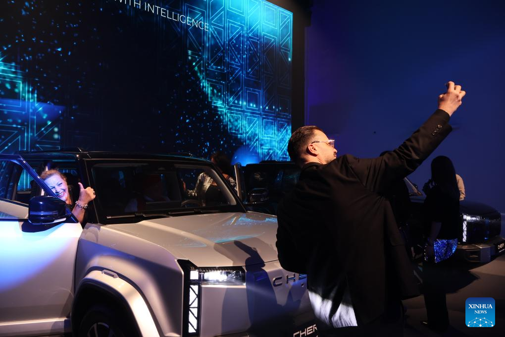 An attendee poses for a photo with an exhibited model during a launch event for Chery's new car in Tunis, Tunisia, on April 16, 2026. Chinese automaker Chery unveiled i03, its first pure electric vehicle in Tunisia, during the car launch event held in Tunis on Thursday. (Photo by Adel Ezzine/Xinhua)