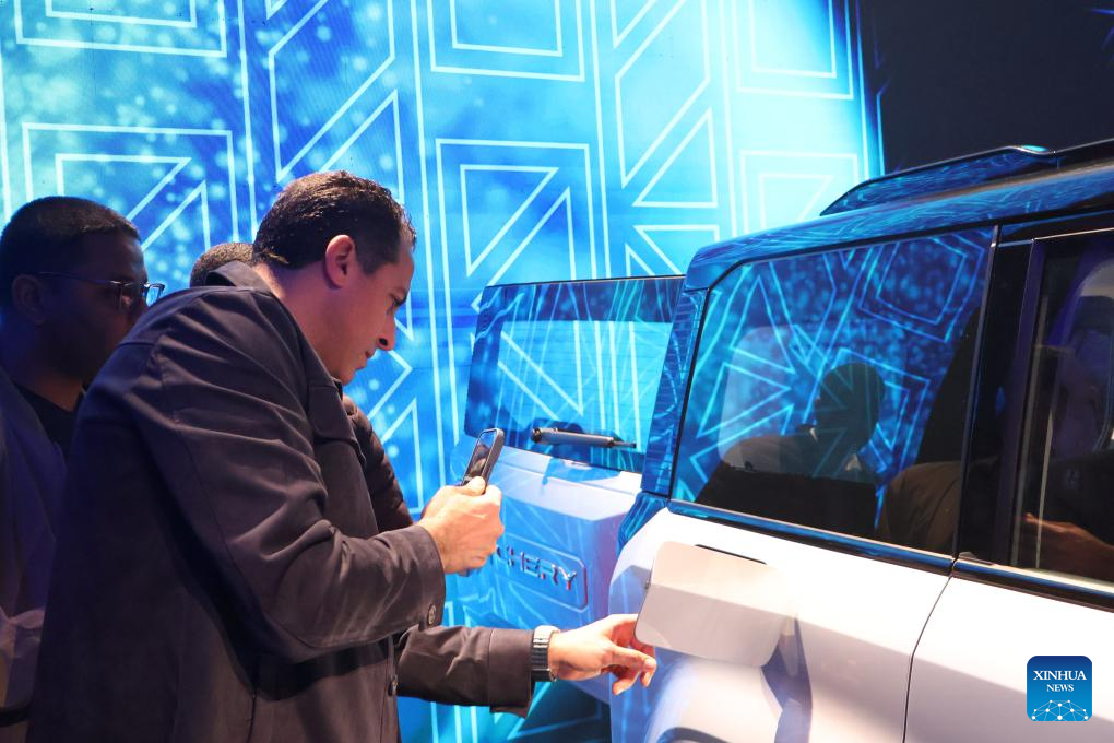 This photo taken on April 16, 2026 shows a scene of a launch event for Chery's new car in Tunis, Tunisia. Chinese automaker Chery unveiled i03, its first pure electric vehicle in Tunisia, during the car launch event held in Tunis on Thursday. (Xinhua/Zhou Haojin)