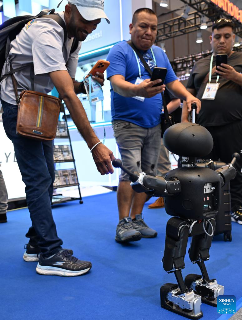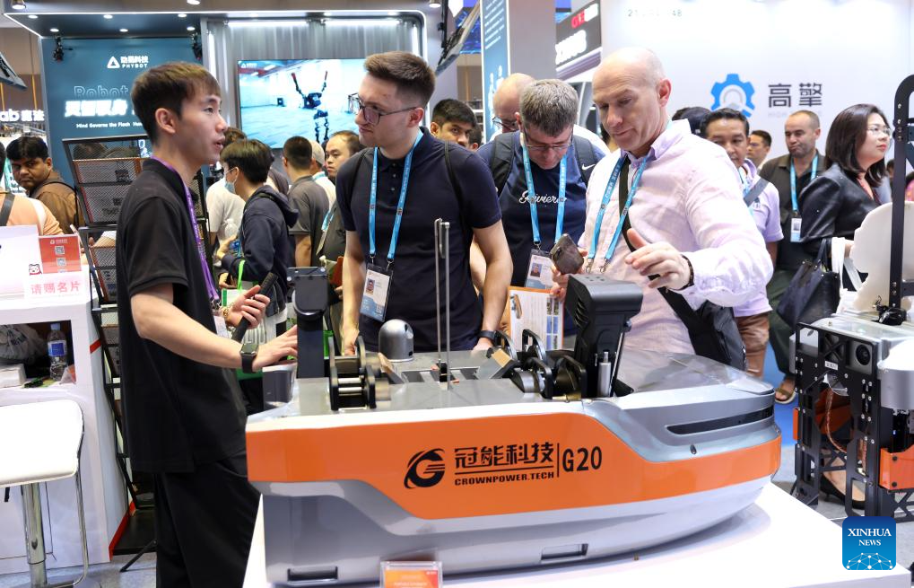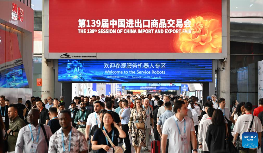 Visitors learn about a robot at the 139th edition of the China Import and Export Fair in Guangzhou, south China's Guangdong Province, April 15, 2026. The 139th edition of the China Import and Export Fair, also known as the Canton Fair, opened here on Wednesday. An exhibition area for service robots is set up at the event, bringing together 46 enterprises to showcase technological innovations and application capabilities in China's service robot sector. (Xinhua/Lu Hanxin)