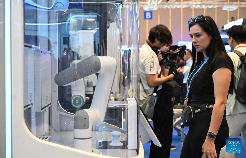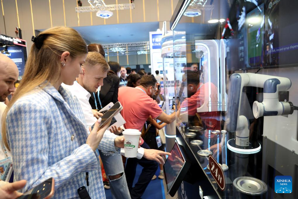 People try a coffee making robot at the 139th edition of the China Import and Export Fair in Guangzhou, south China's Guangdong Province, April 15, 2026. The 139th edition of the China Import and Export Fair, also known as the Canton Fair, opened here on Wednesday. An exhibition area for service robots is set up at the event, bringing together 46 enterprises to showcase technological innovations and application capabilities in China's service robot sector. (Xinhua/Lu Hanxin)