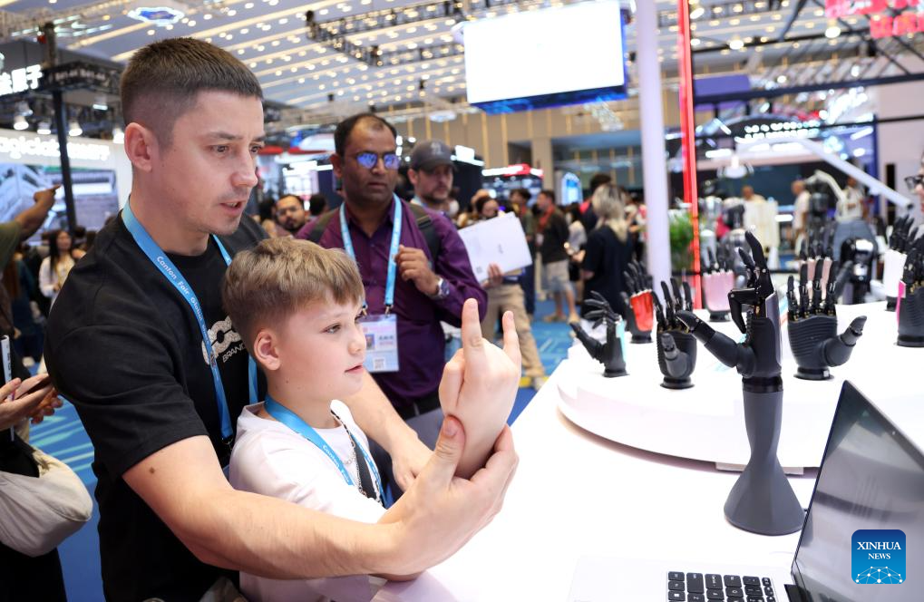 Visitors interact with a bionic hand at the 139th edition of the China Import and Export Fair in Guangzhou, south China's Guangdong Province, April 15, 2026. The 139th edition of the China Import and Export Fair, also known as the Canton Fair, opened here on Wednesday. An exhibition area for service robots is set up at the event, bringing together 46 enterprises to showcase technological innovations and application capabilities in China's service robot sector. (Xinhua/Lu Hanxin)