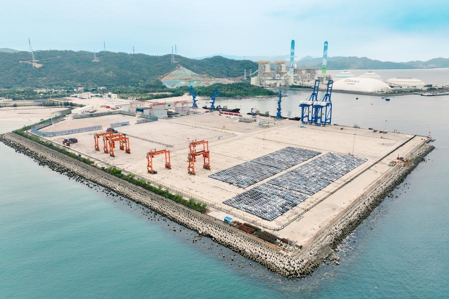 An aerial drone photo taken on April 3, 2026 shows new energy vehicles ready for delivery at Xiaomo international logistics port in the Shenzhen-Shanwei Special Cooperation Zone in south China's Guangdong Province. (Xinhua)