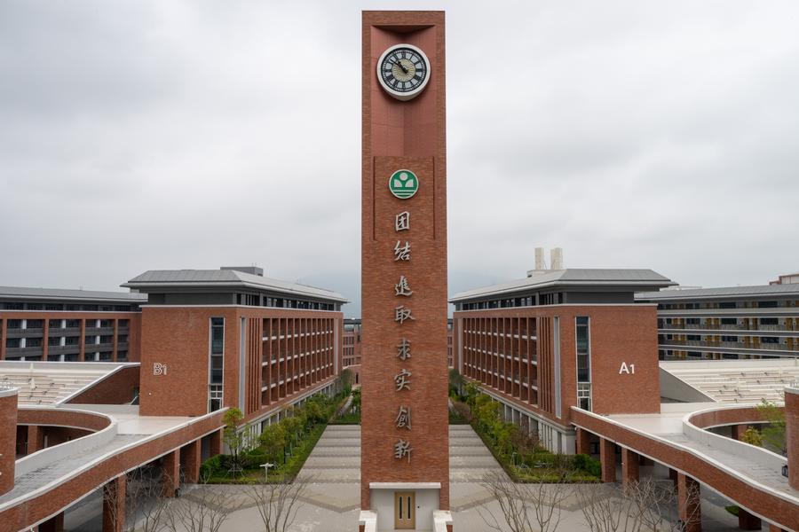 This photo taken on March 29, 2026 shows the clock tower at a middle school in the Shenzhen-Shanwei Special Cooperation Zone in south China's Guangdong Province. (Xinhua/Liu Mengqi)