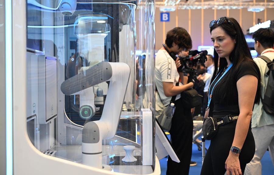 A visitor looks at an ice cream making robot at the 139th edition of the China Import and Export Fair in Guangzhou, south China's Guangdong Province, April 15, 2026. (Xinhua/Deng Hua)