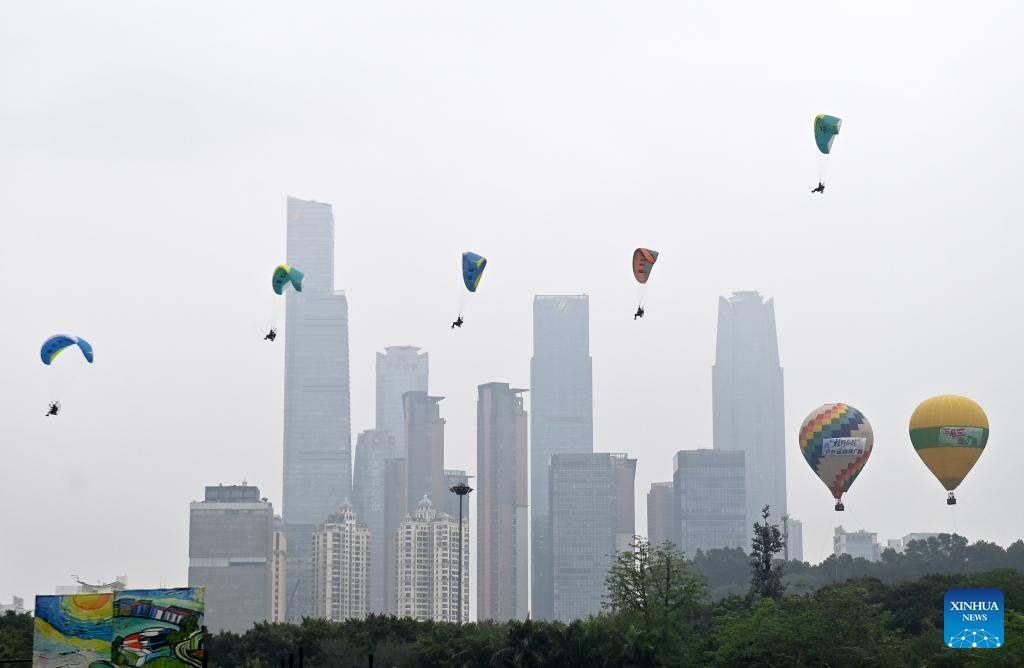 Performers fly powered paragliders in an event celebrating the Sanyuesan Festival in Nanning, south China's Guangxi Zhuang Autonomous Region, April 19, 2026. The Sanyuesan Festival is a traditional festival celebrated on the third day of the third lunar month by various ethnic groups in China, which falls on April 19 this year. (Xinhua/Lu Boan)