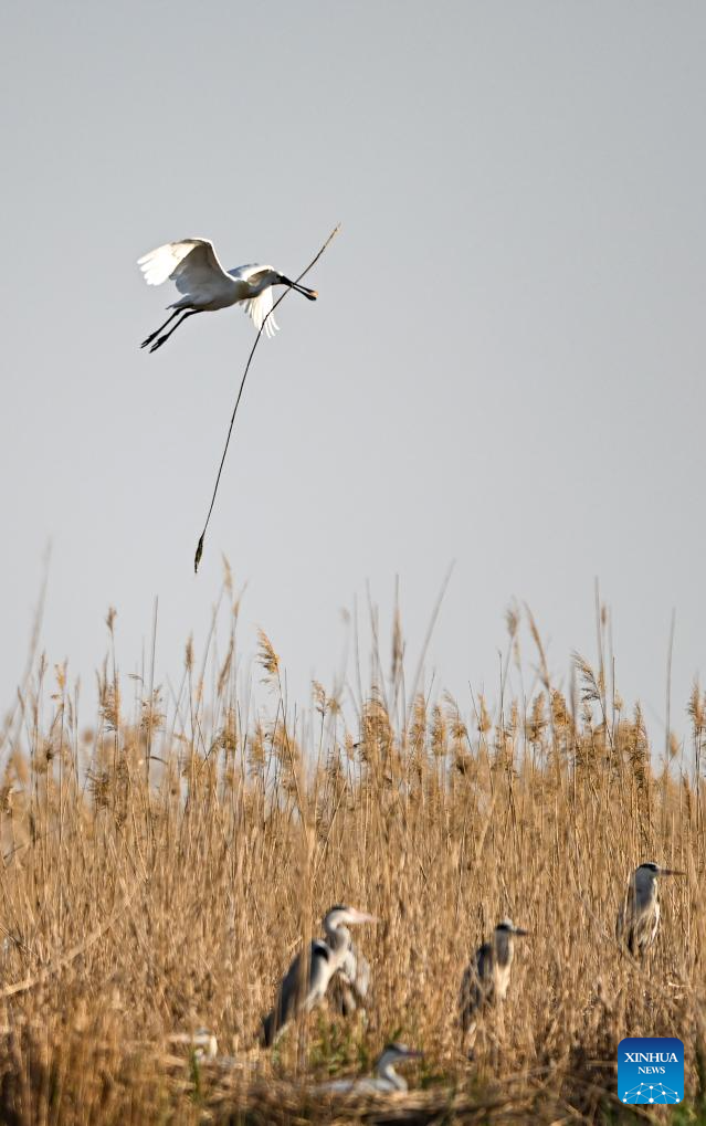 Herons return to their nest at Shahu scenic area in Pingluo County of Shizuishan City in northwest China's Ningxia Hui Autonomous Region, April 17, 2026. From March to October each year, the Shahu scenic area serves as an important breeding habitat for migratory birds, featuring vast expanses of water, abundant plankton, fish and shrimp, and a variety of ecosystems.